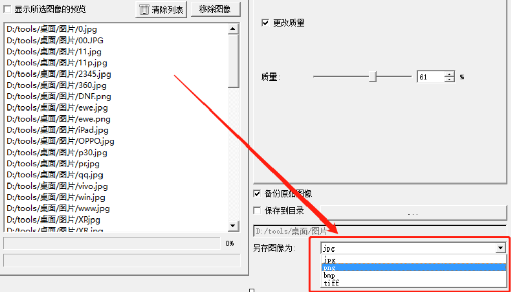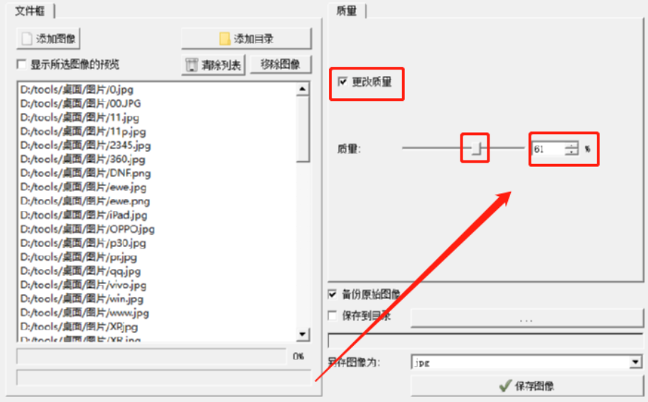 3.点击确定按钮之后文件夹中的所有图片就全部识别出来了,然后我们勾选右边的“更改质量”这个选项可以自定义压缩图片的质量。