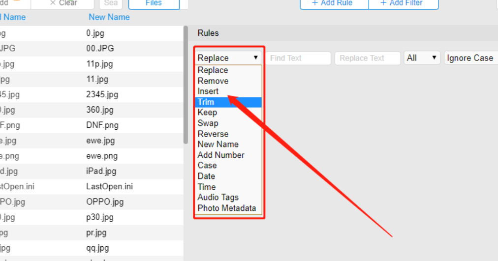 4.点击添加规则之后在最左边的下拉列表中可以选择重命名文件的一些规则,包括插入、替换、日期等规则,用户根据自己的需求选择即可。