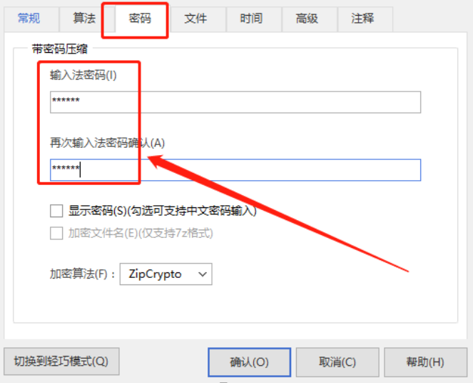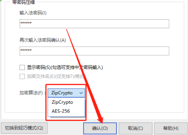 4.设置好加密压缩的密码之后我们还可以选择加密算法,打开下拉列表之后进行选择即可,选择完成之后点击确认按钮。