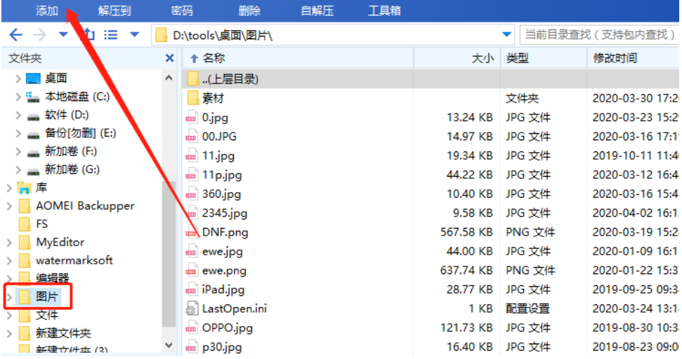1.首先第一步我们打开软件之后在界面左边点击选择想要压缩的文件夹,然后点击上方的添加这个功能按钮。