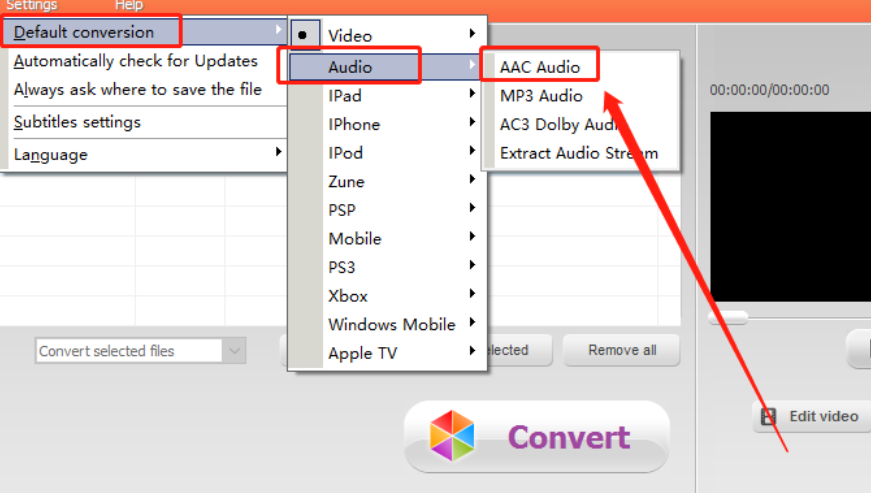 4.点击设置选项之后根据下图所示的步骤找到Audio选项,就可以选择它下面的音频格式了,我们点击AAC格式即可。