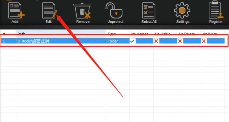 4.紧接着下一步我们选择的文件夹就已经被加密到软件界面了,然后我们选中文件夹点击上方的Edit这个功能按钮可以对文件夹权限进行编辑。