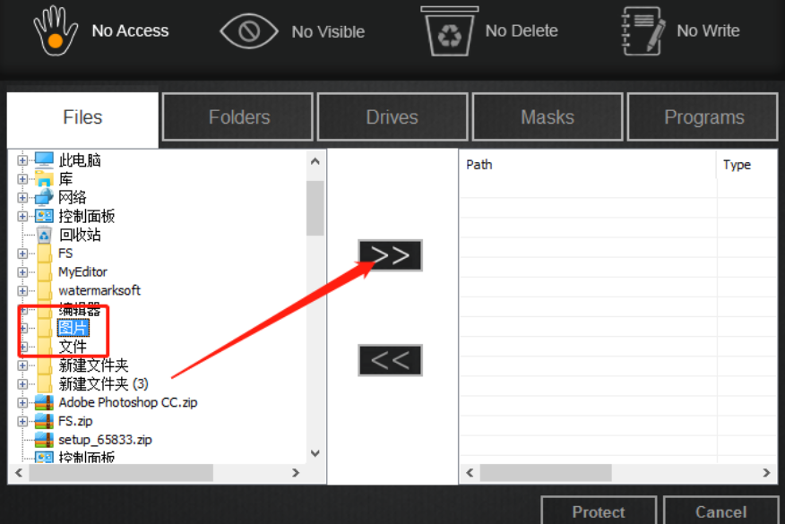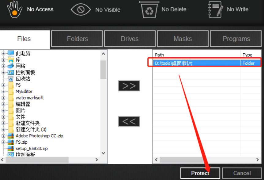 3.点击这个向右的箭头之后就将选择的文件夹添加到待处理的列表中了,然后我们点击下方的Protect这个功能按钮。