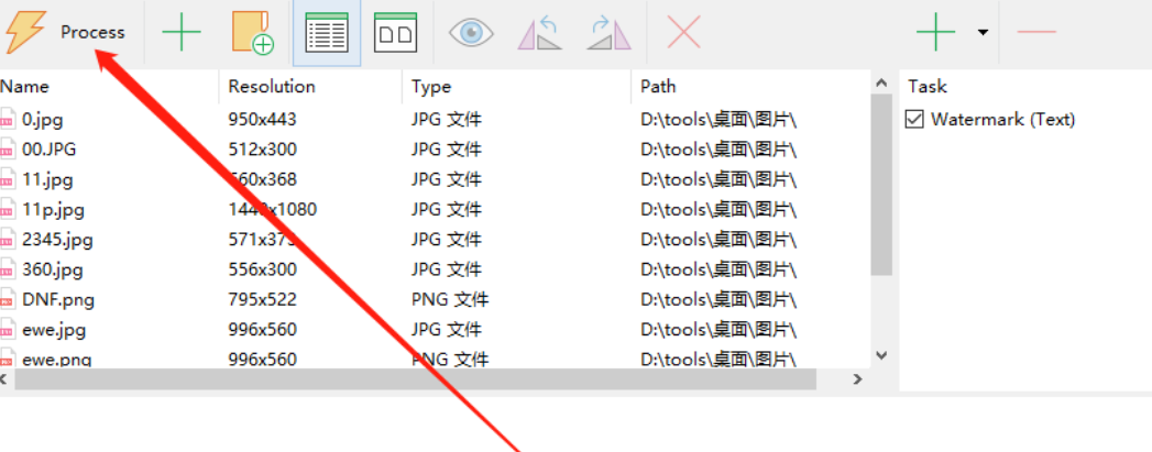 6.最后我们设置好水印之后在界面右边就可以看到添加的这个设置水印的任务了,点击界面左边的Process这个按钮即可开始批量给图片添加水印。