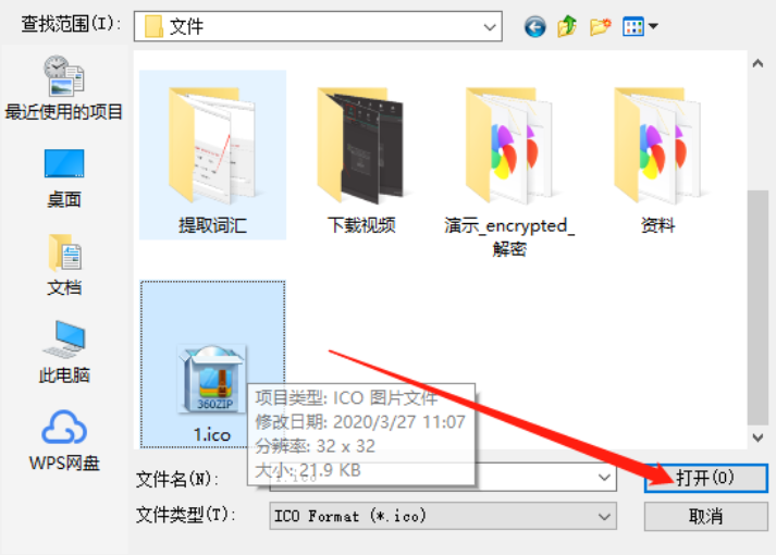 5.点击三点按钮之后会打开让我们选择水印图标文件的界面,我们在界面中选中想要制作成水印的图标文件,然后点击打开按钮。