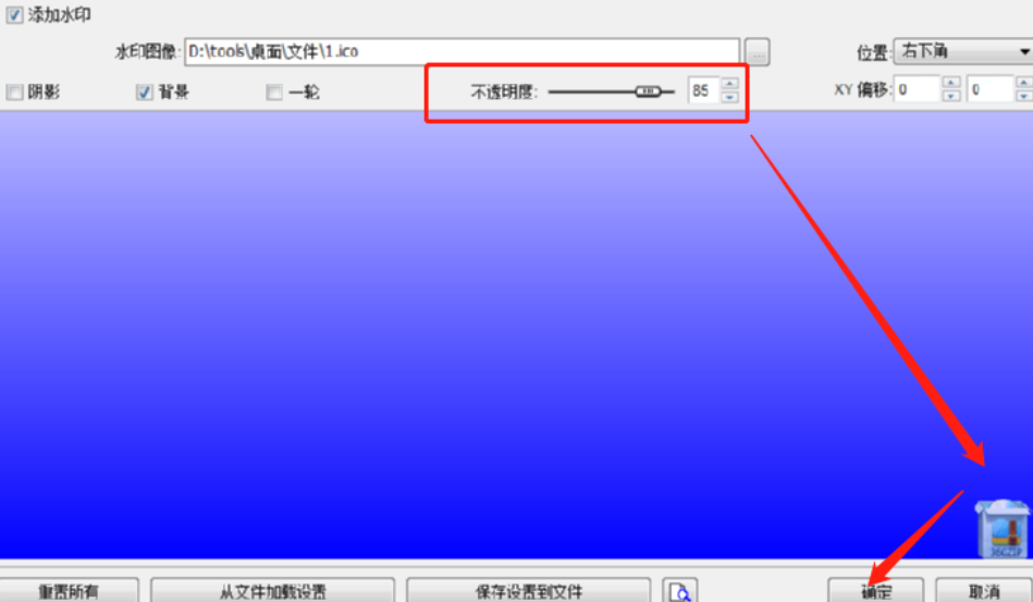 6.点击打开之后我们就可以在添加水印的界面中预览到水印的效果了,如下图中所示,满意的话点击确定按钮即可保存水印设置。