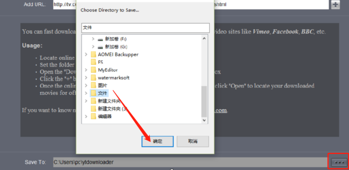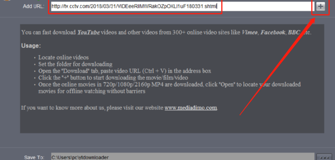 3.设置好储存下载视频的位置之后,我们点击将想要下载的视频链接复制到输入框中,然后点击右边的加号按钮。