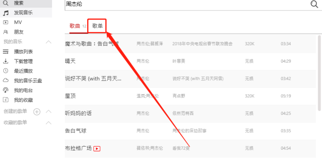 3.点击这个搜索图标之后软件就会开始搜索相关的歌曲了,然后我们可以在界面中点击切换到歌单中。