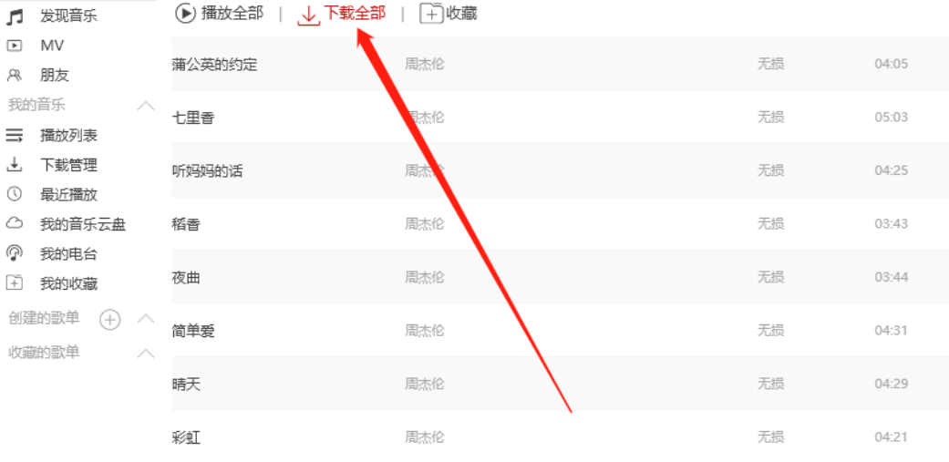 5.最后在歌单界面我们可以看到歌单中的所有歌曲,然后点击界面上方的下载全部这个功能按钮即可将这些歌曲批量下载下来。