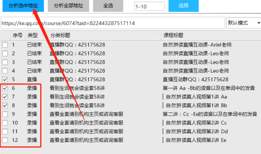 3.紧接着下一步我们找到这些视频中类型为录播的视频课程,勾选之后点击上方的分析选中地址这个功能按钮。