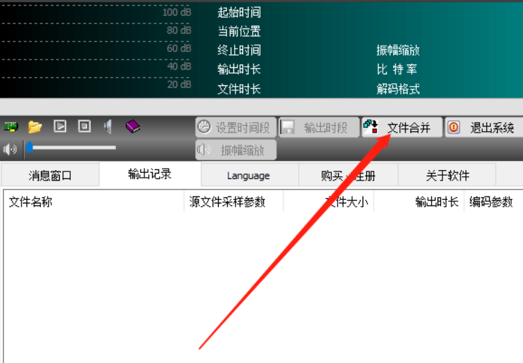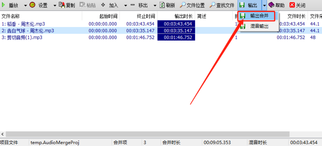 4.点击打开按钮之后音频就成功添加到软件了,然后下一步我们点击界面中的输出按钮,接着选择输出合并这个功能选项。