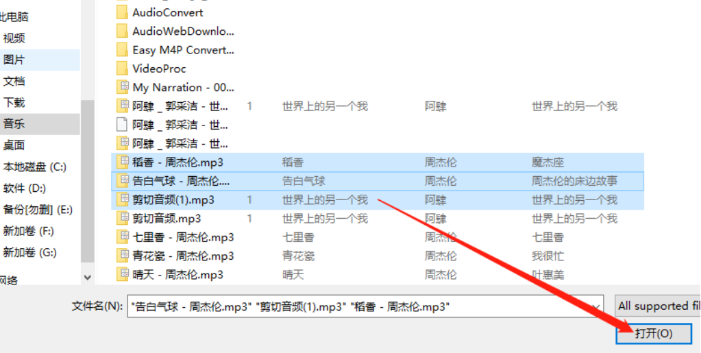 3.点击加入文件选项之后我们在出现的界面中即可选中想要合并的音频文件,全部选中之后点击界面右下角的打开按钮。