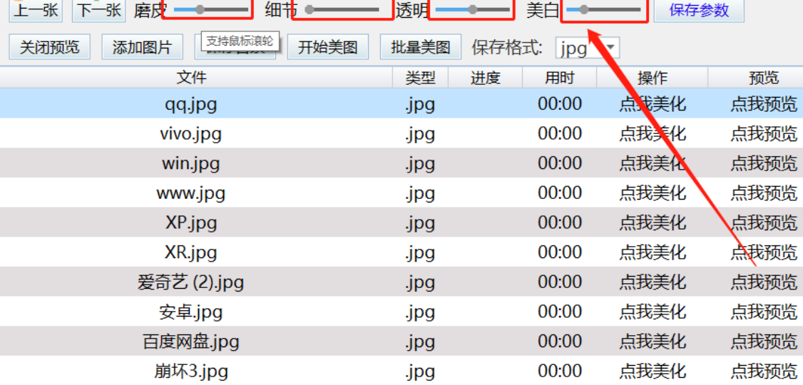 3.点击打开按钮之后选择的图片会被全部添加到软件界面中,然后我们在界面上方可以看到有磨皮、美白、透明等美化功能可以调节。