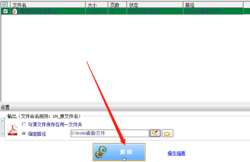 4.设置好解锁文件的输出储存位置之后我们就可以点击界面中的解锁这个功能按钮了,如下图中所示。