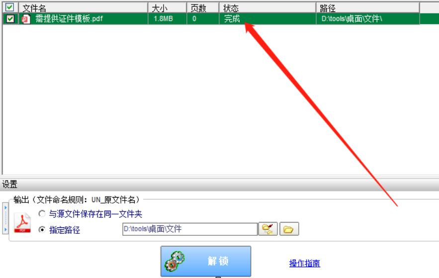 6.点击是按钮之后就会开始解锁文件的操作,等到界面中文件的状态显示为完成之后就表示已经成功解锁文件了。