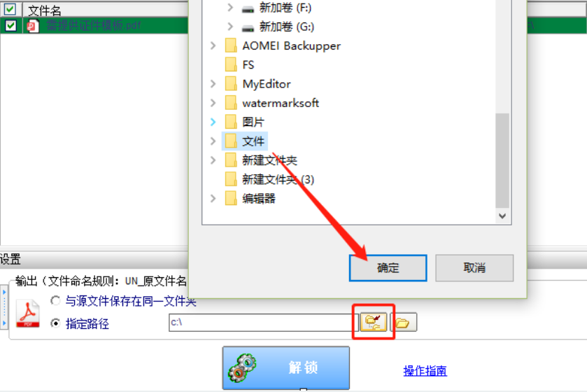 3.点击打开按钮之后文件就成功添加进来了,然后我们点击下方指定路径右边的文件夹图标,如下图中所示,点击之后可以更改解锁之后的文件储存位置。