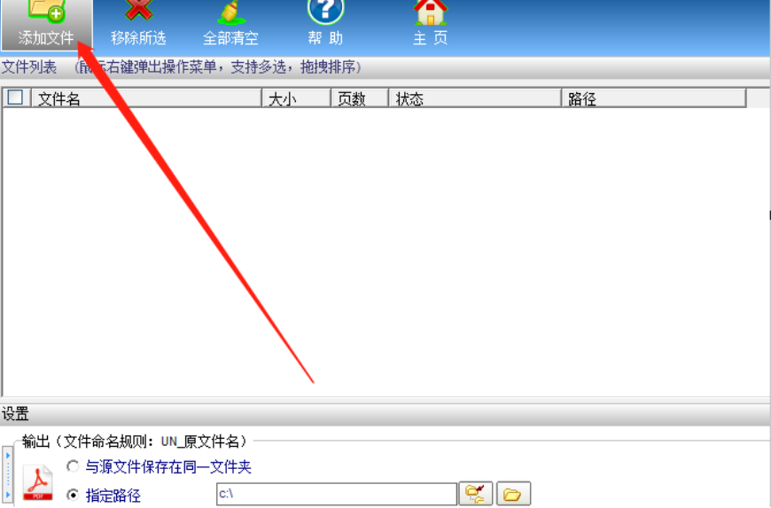 1.首先第一步我们打开软件之后在界面左上角点击添加文件按钮,点击之后添加需要解锁的PDF文件。