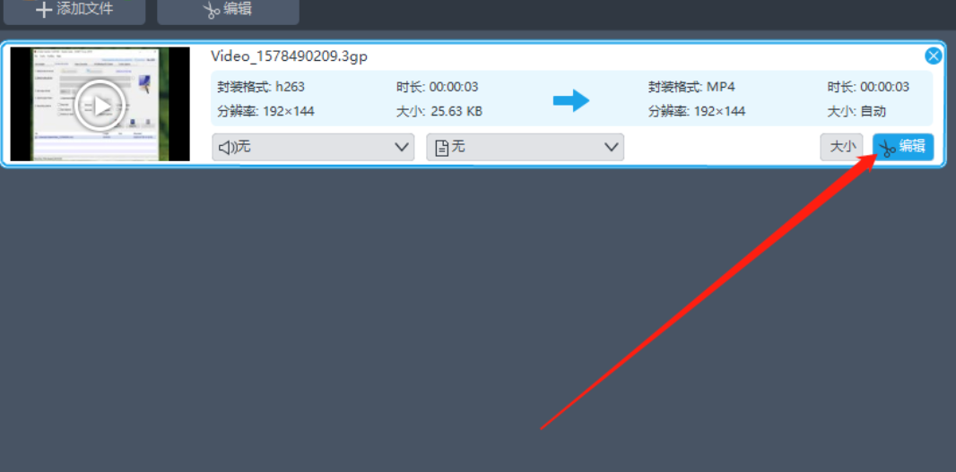 3.点击打开按钮之后视频就添加到软件界面中了,然后我们在这个视频列表中点击编辑这个功能按钮。