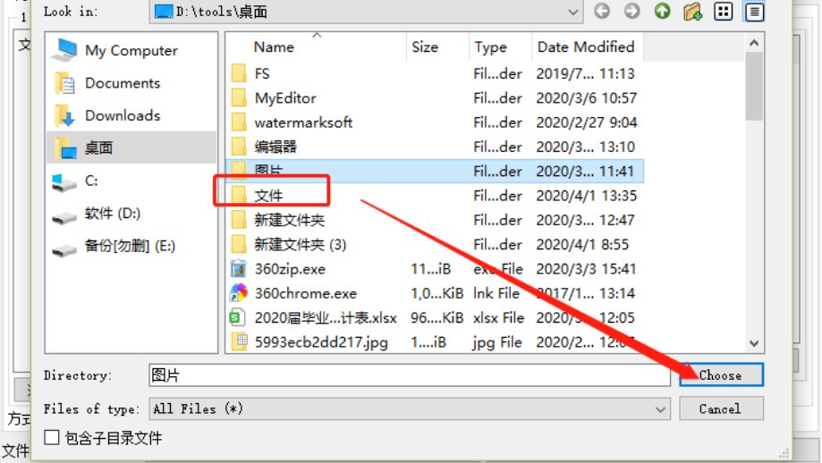 2.点击添加目录按钮之后就会打开选择文档所在文件夹的步骤了,我们需要在这个界面中找到想要替换内容的Word文档所在的文件夹,找到之后选中它点击右下角的Choose按钮。