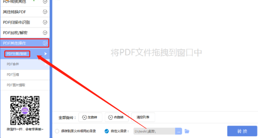 1.首先第一步我们打开软件之后在软件界面的左边列表中找到PDF其他操作这个功能选项并打开,打开之后在其中选择PDF分割/旋转这个功能。