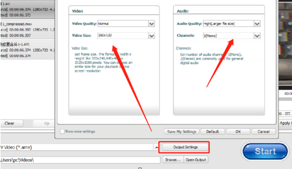 4.选择好输出格式之后我们点击后面的Output settings这个输出选项功能,在出现的界面中可以设置输出视频的质量和大小,视频中的音频质量和音质都是可以设置的。