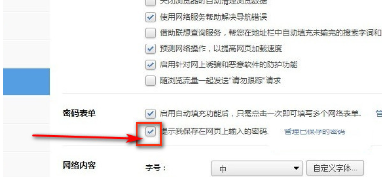 4.最后在高级设置的密码表单模块我们就可以看到“提示我保存在网页上输入的密码”这个选项了,然后将这个选项勾选上即可。