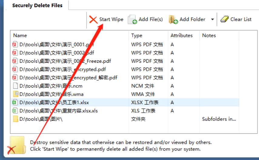 4.将想要删除的文件都添加到软件界面之后,我们点击界面中的Start Wipe这个按钮就可以开始删除选择的这些文件了。