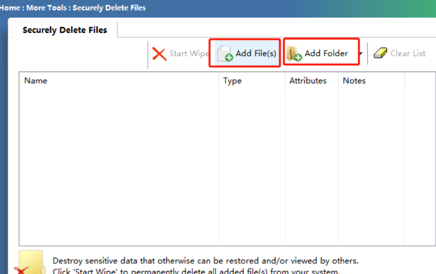 2.点击进入到Securely Delete Files这个功能界面之后,我们可以点击Add File按钮或者Add Folder按钮来添加想要安全删除的文件或文件夹。