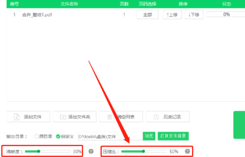 3.点击打开按钮之后下一步我们在界面中就可以看到选择的这个PDF文件了,然后我们在界面最下方可以选择清晰度和压缩比进行设置。