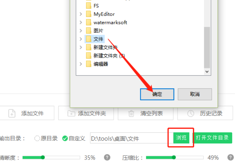 4.设置好清晰度和压缩比之后,我们点击界面中的浏览按钮可以更改文件压缩之后的输出储存路径,选择好路径位置之后点击确定按钮即可。