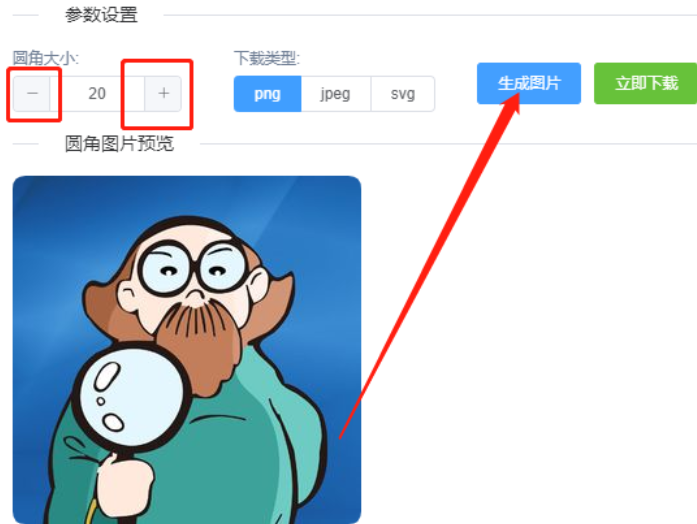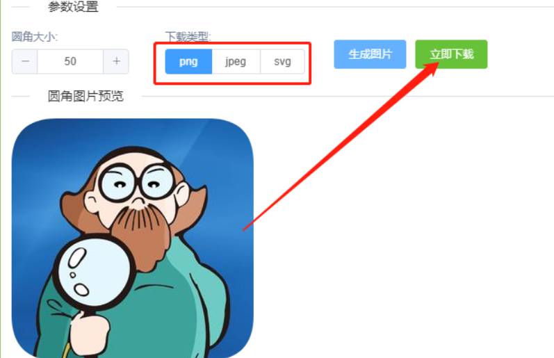 6.预览到转圆角的效果之后点击立即下载按钮可以将圆角图片给保存下来,下载之前可以选择想要下载图片的类型。