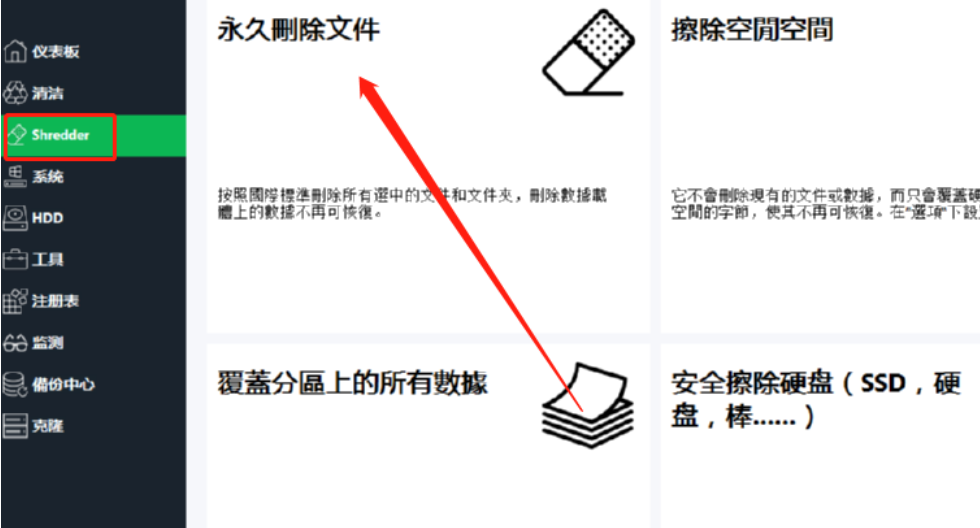 1.首先第一步我们打开软件之后在界面左边列表中找到Shredder这个选项模块,点击之后在右边界面就可以看到永久删除文件这个功能了,然后点击进去。