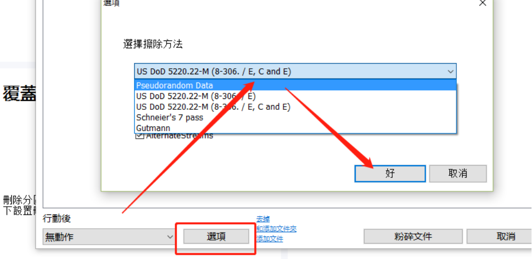 4.点击打开按钮之后下一步点击界面中的选项这个功能按钮,然后在出现的界面中可以选择删除文件的方法,没有特殊需求的用户可以使用默认的删除方法。