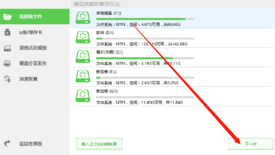 2.进入到恢复误删除文件界面之后我们在界面中选中想要恢复文件的磁盘,选中之后点击右下角的下一步按钮。