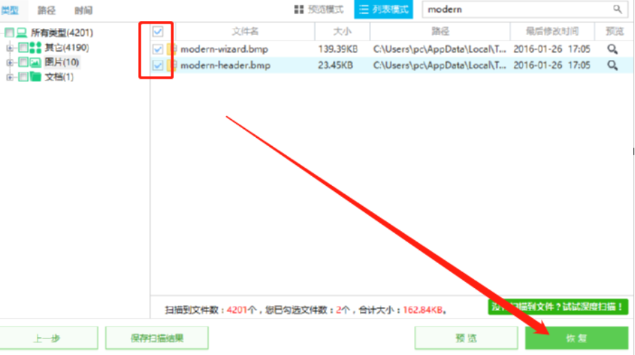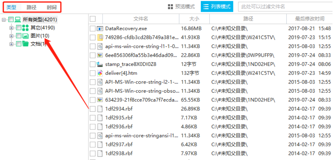 4.等到扫描完成之后在界面左边我们就可以根据自己想要恢复文件的类型、路径或者时间来查找到想要恢复的删除文件了。