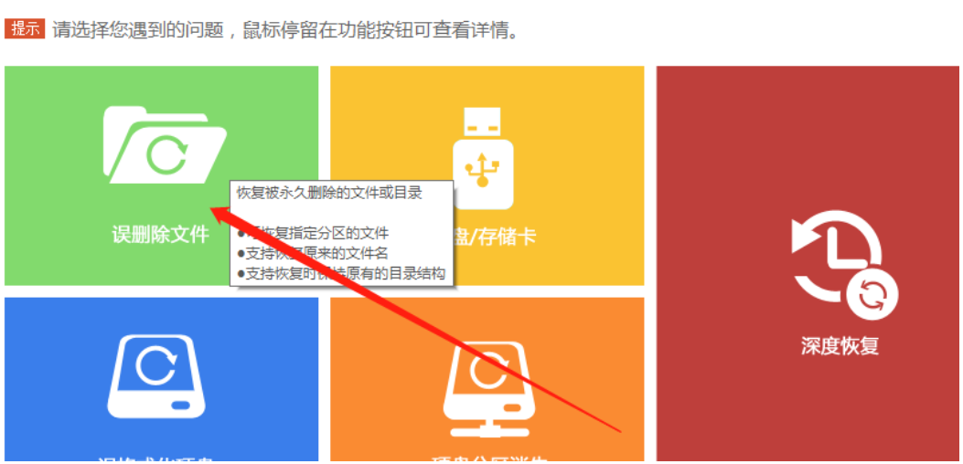 1.首先第一步我们打开软件之后点击误删文件这个功能模块,点击进入到恢复误删文件的功能界面中。