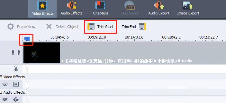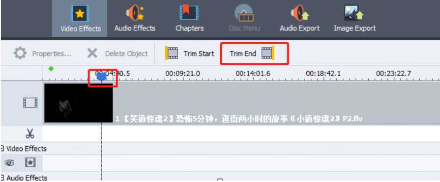 4.进入到编辑视频的界面之后我们就可以在界面下方看到视频进度条了,然后我们点击移动指针,并点击Trim Start按钮即可选择开始时间。