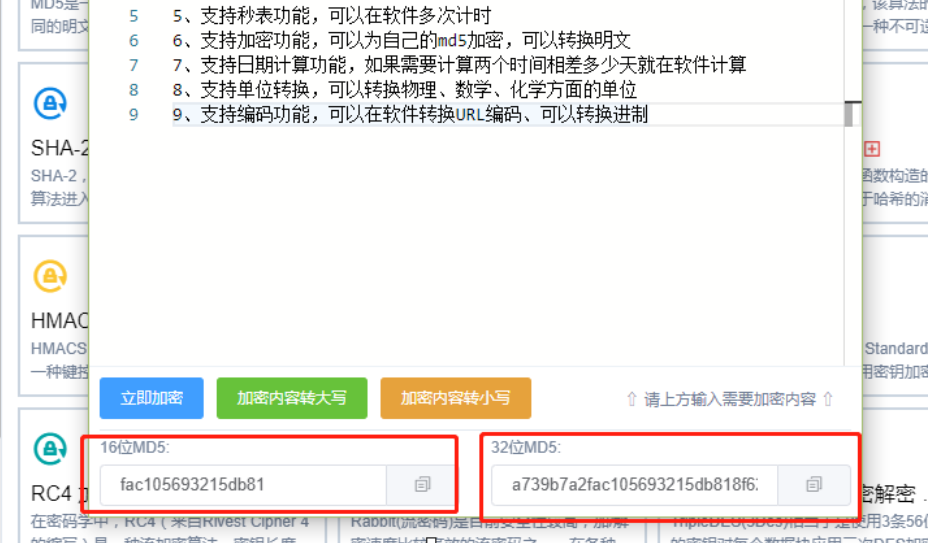 4.等到加密完成之后就会在下方显示加密之后的文本内容了,分别有16位MD5码和32位MD5码,我们可以选择自己想要保存的那一个加密码。