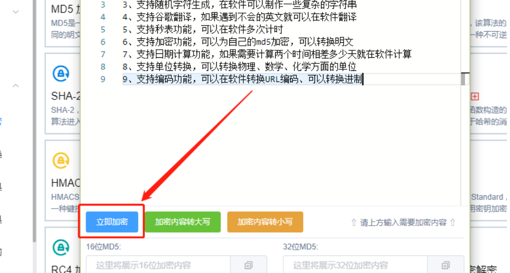 3.点击进入到MD5加密界面之后,我们将需要加密的文本内容复制到这个文本框中,然后点击左下角的立即加密按钮即可进行加密。