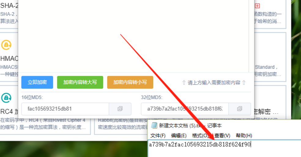 5.最后我们将这个加密码复制保存到记事本中,当我们需要用到的时候通过MD5的解密之后就可以看到原来的文本内容了。