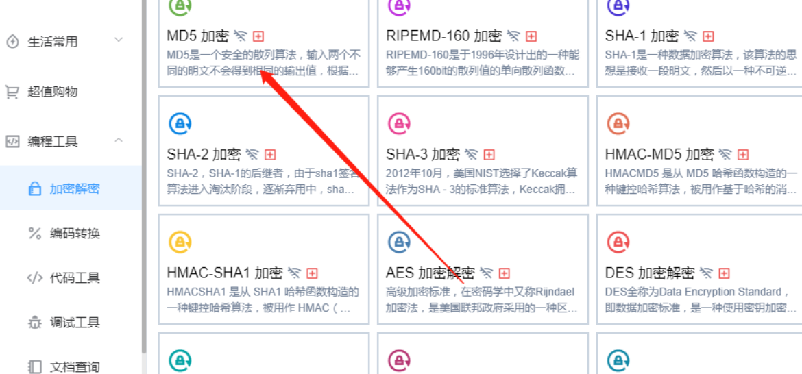 2.点击加密解密之后我们就可以在界面中看到很多的加密方式选择了,然后我们点击进入到MD5加密这个功能模块。