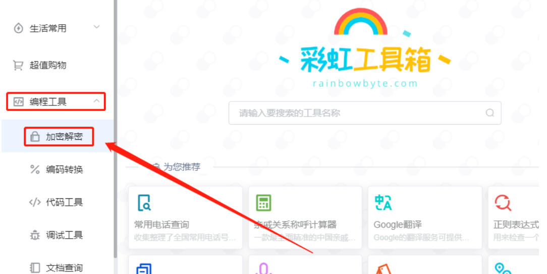 1.首先第一步我们打开软件之后,在界面左边的列表中找到编程工具这个功能模块,点击打开之后选择其中的加密解密这个功能。