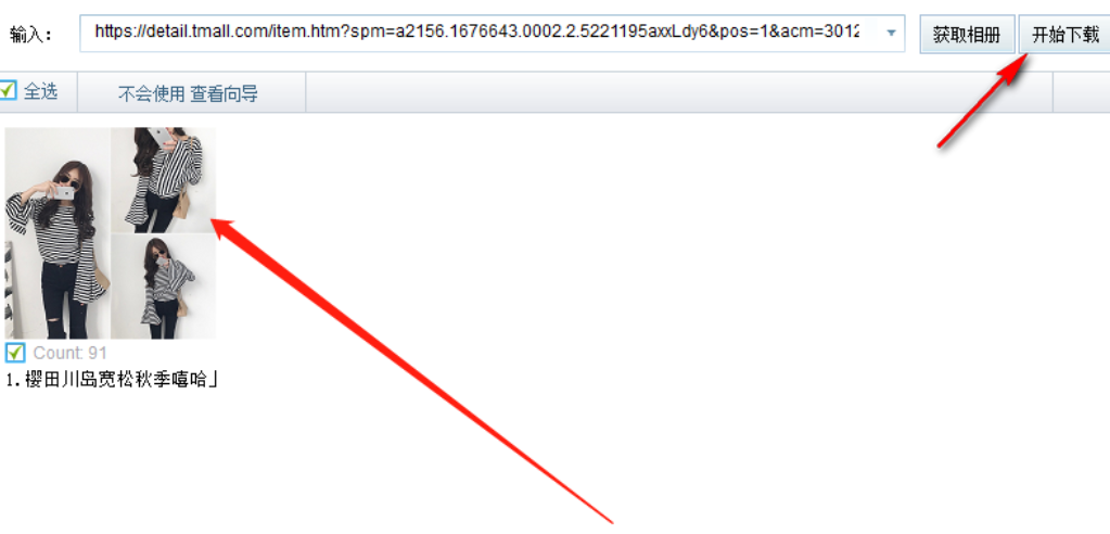 3.获得商品图片相册之后我们在界面中就可以看到商品相册列表了,如下图中所示,然后点击右上方的开始下载按钮即可开始下载。