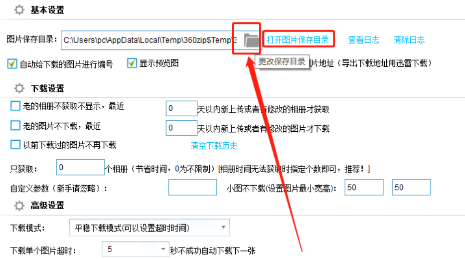 4.开始下载之后我们切换到选项设置界面,点击打开图片保存目录这个选项可以打开图片保存的位置查看图片,如果需要更换地址的话在开始下载之前要点击更改保存目录的文件夹图标。