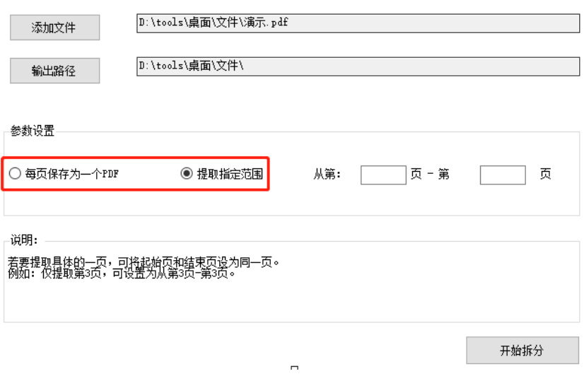 5.选择拆分指定范围页面的话我们在后面输入想要拆分提取的页面范围之后,点击右下角的开始拆分按钮即可进行拆分文件的操作。