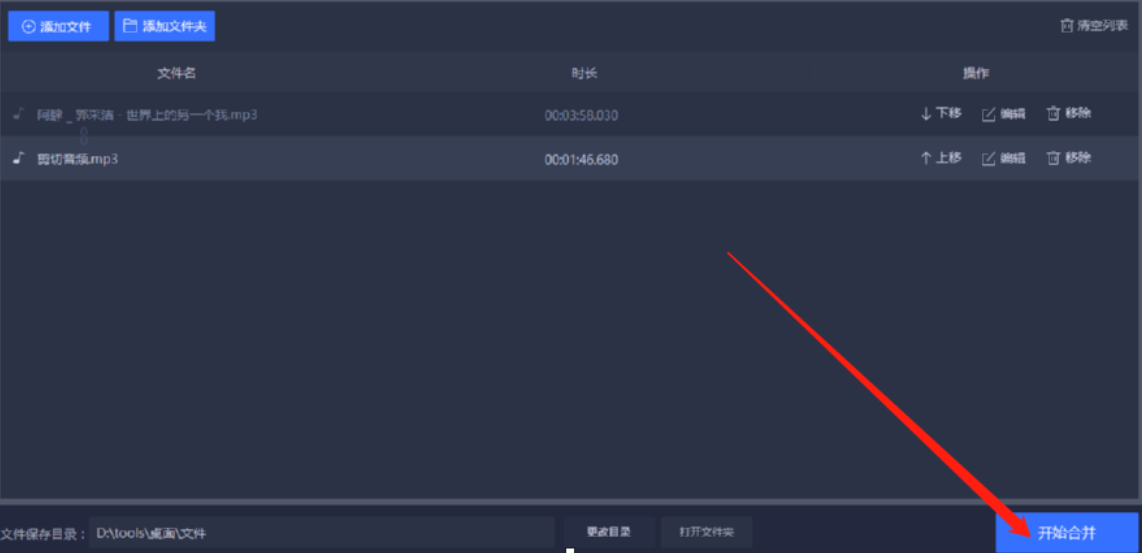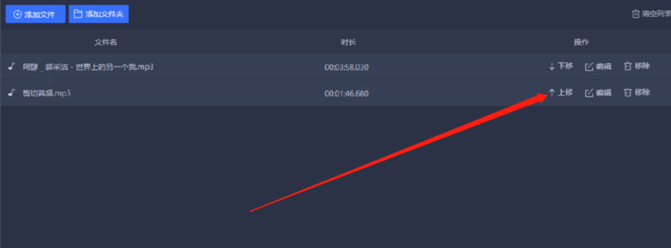 3.点击这个打开按钮之后我们就可以在界面中看到添加进来的音频文件了,然后我们点击上移或下移可以调整它们合并的顺序。
