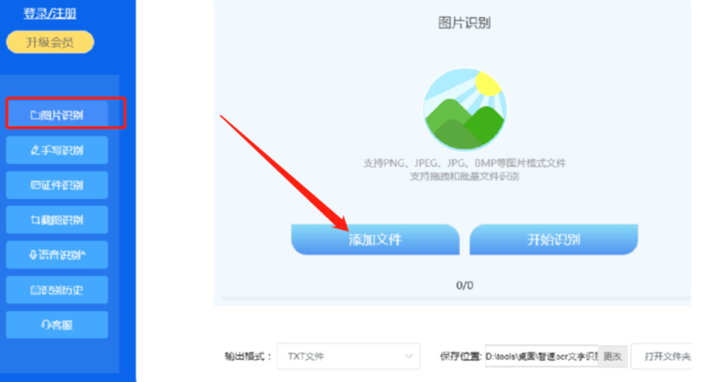 1.首先第一步我们打开软件之后在界面左边点击图片识别这个功能按钮,然后在右边界面中点击添加文件按钮。