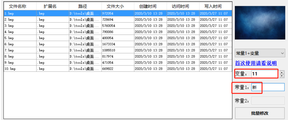 4.选择好重命名方式之后还需要根据自己的需求来填写变量和常量,变量填写数字,常量可以是文字,如下图中所示。