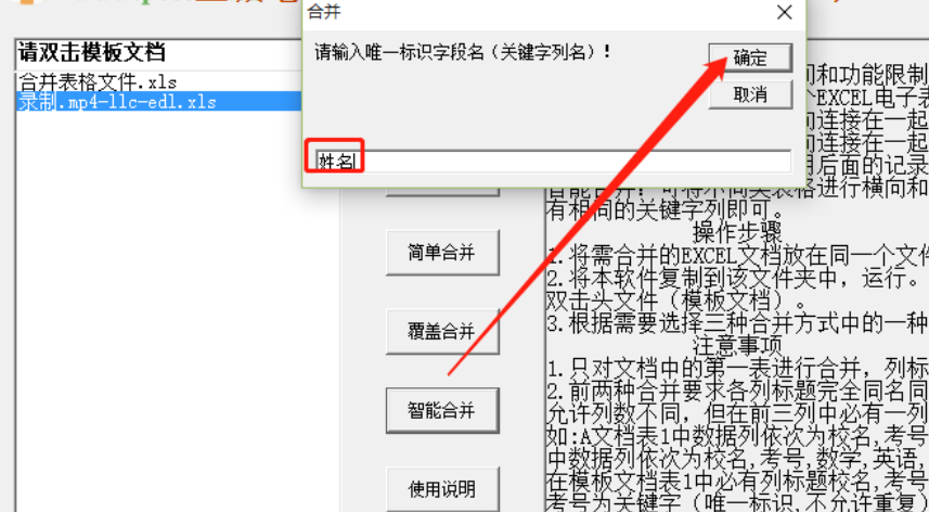 4.点击智能合并之后接下来需要在出现的界面中输入想要合并Excel文件的关键字列名,输入成功之后点击确定按钮。
