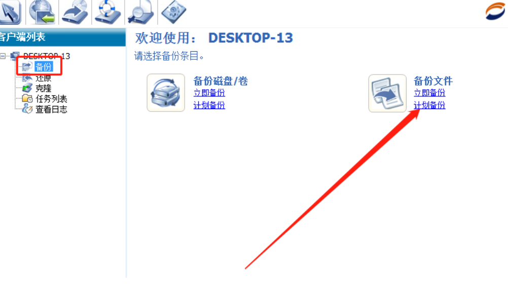 1.首先第一步我们打开软件之后在软件的界面左边点击备份这个功能选项,然后在界面的备份文件模块中点击计划备份。